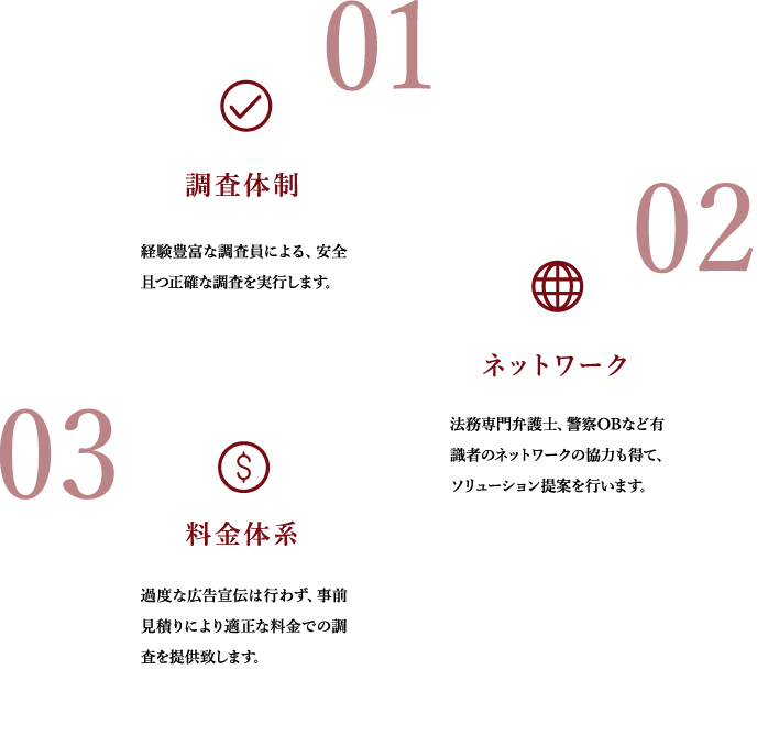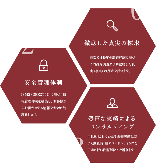M&Aや新規取引に伴う信用調査・デューディリジェンスから、不正・不祥事に関する事実確認調査、反社会的勢力背景調査など、行動調査、内偵、データ調査を駆使し問題解決のための情報提供を行います。