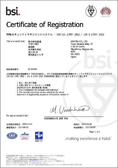 株式会社産通は、当社の情報資産及び取り扱う情報をはじめとするすべての業務に関して、情報セキュリティマネジメントシステムの国際規格「ISO27001」及び国内規格「JIS Q 27001」の認証を取得しています。ISO27001/ISMS とは、情報セキュリティ管理に対する国際水準の第三者適合性評価制度です。私たちは継続的に情報セキュリティレベルの向上への取り組みを実施し、安全、安心な情報提供を通じて社会に貢献してまいります。